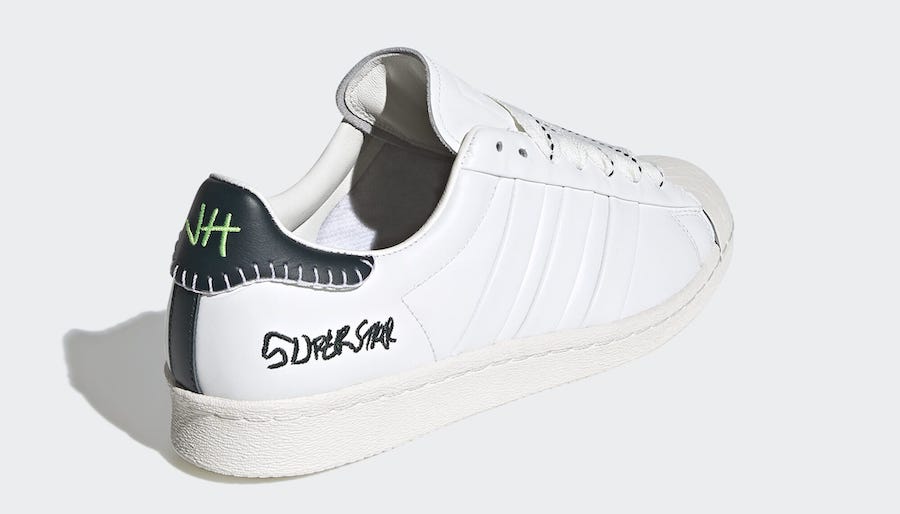 Jonah Hill x adidas Superstar. Der weiße Ledersneaker kommt an der Ferse mit einem handschriftlichen Superstar-Schriftzug.