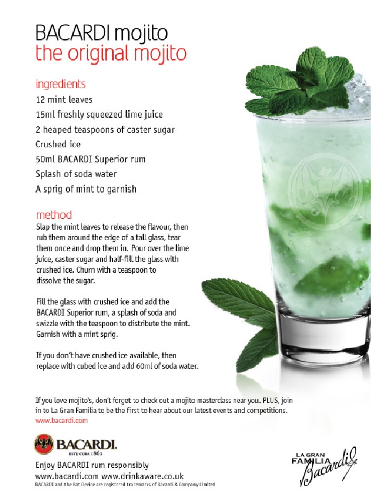Lime Bacardi Rum spearmint splenda Sprite Zero Boozy Mojito Pops Mom on the side lemon-lime soda fresh mint leaves Bacardi Rum lime juice simple syrup and 3 more Best Rum For Mojitos And A Great Mojito Ramshackle Pantry. Ingredients12 mint leaves3tsp freshly squeezed lime juice2 ts. Bacardi Mojito Original Recipe Watch later.